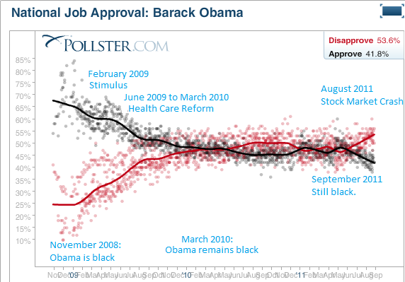 Obama was very popular when elected, and he has consistently polled higher than his own policies, suggesting that people want to like him, but aren't pleased with what he has been doing. Let me show you this annotated graph to see if it makes it easier for you.