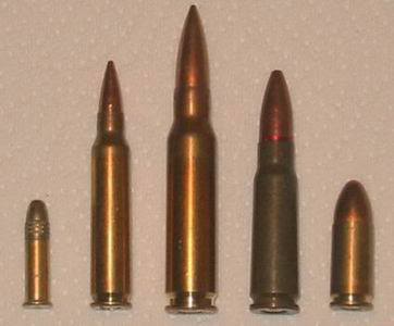 From left to right it's a .22 LR, 5.56, 7.62 NATO, 7.62 WP, and 9 mm.