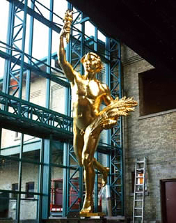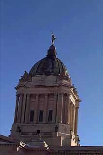 The Golden Boy is a statue that stands on top of the Manitoba Legislative building dome. It was taken down in 2002 for restoration and temporarily put on public display.