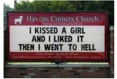 I pass a lot of churches on my drive to and from work - small ones, large ones, and ones with amusing signs. One church in particular has had two, uh, interesting signs out front recently.