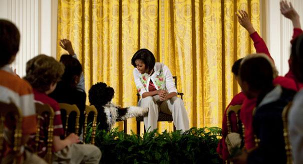 Bo questions Michelle on the president's stance on Israeli settlements in the West Bank.
