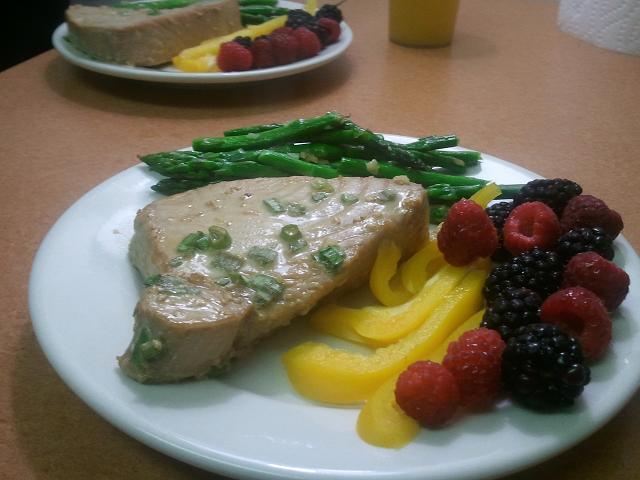 Monday night I made tuna steaks and asparagus, served with yellow peppers, raspberries, and blackberries.