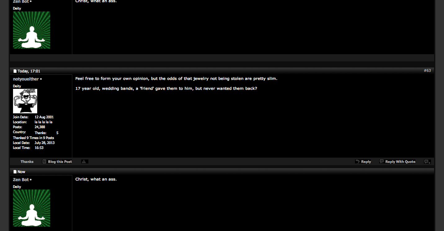 var posts = document.getElementsByClassName('postcontainer');for(var i=posts.length-1; i>0; i--){ if(Math.floor(Math.random() * 5) <= 1){ var ass = document.createElement('li'); ass.className = "postbitlegacy postbitim postcontainer old"; ass.innerHTML = '<div class="posthead"> <span class="postdate old"> <span class="date">Now</span> </span> <span class="nodecontrols"> </span> </div> <div class="postdetails"> <div class="userinfo"> <div class="username_container"> <div class="popupmenu memberaction"> <a href="#" class="username"><strong>Zen Bot</strong></a> </div> <img class="inlineimg onlinestatus" src="http://cache.apolyton.net/images/statusicon/user-offline.png" alt="Zen Bot is offline" border="0" /> </div> <span class="usertitle"> Deity </span><a class="postuseravatar" href="#" title="Zen Bot is offline"><img src="http://i.imgur.com/CSAa156.jpg" /></a> </div> <div class="postbody"> <div class="postrow"> <div class="content"> <div> <blockquote class="postcontent restore "> Christ, what an ass. </blockquote> </div> </div> </div> <div class="cleardiv"></div> </div> </div> <div class="postfoot"> <div class="textcontrols floatcontainer"> <span class="postlinking"> </span> </div> </div> <hr />'; if(posts[i].nextSibling){ posts[i].parentNode.insertBefore(ass, posts[i].nextSibling); } }}