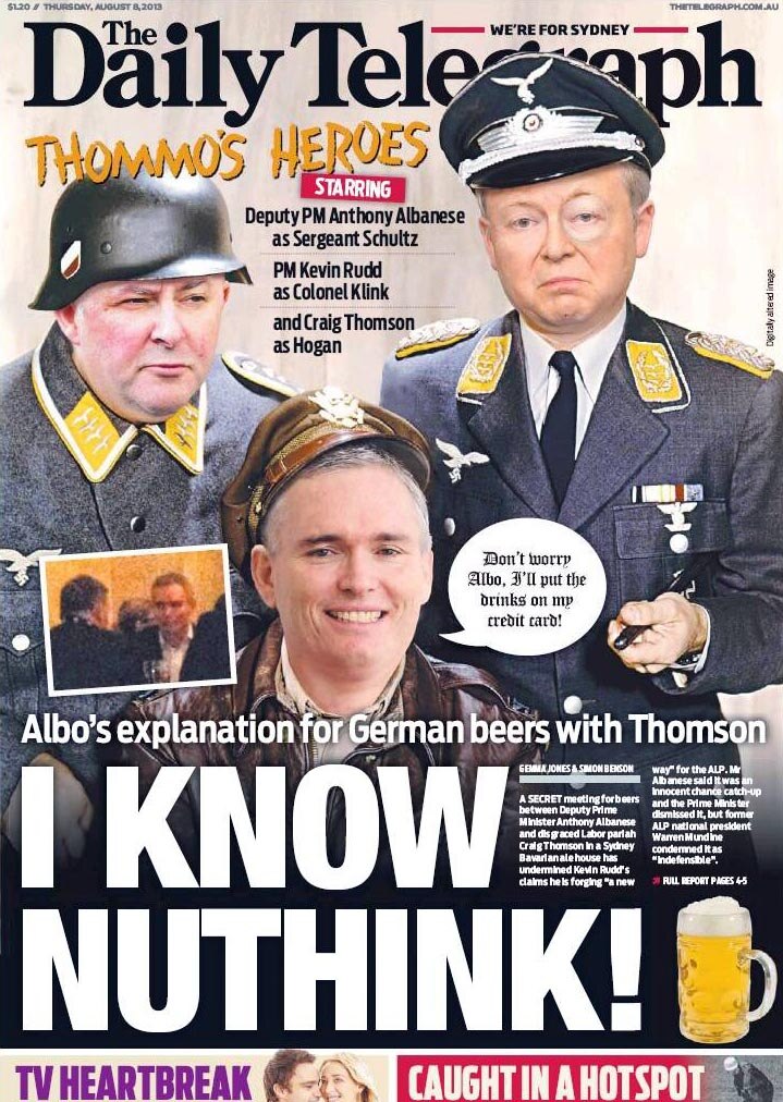 Another front page linked PM Rudd to Colonel Klink, and a disgraced MP