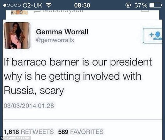 Without pausing to check her facts, or her spelling, Gemma Worrall, 20, wrote: 'If barraco barner is our president, why is he getting involved with Russia, scary.'