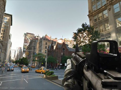 It's simple in concept but brilliantly executed: The shop simply used Google's Street View database of 360 degree street-level photography, and imposed an automatic rifle sight and some sound effects on top of it.
