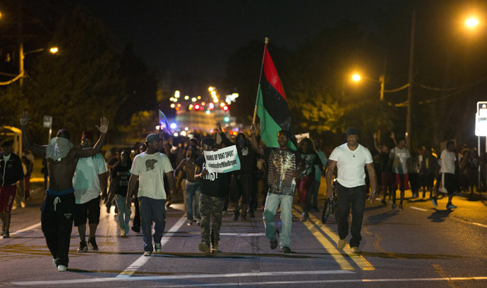 FERGUSON, Mo. - A huge crowd of people protesting the death of a black Missouri teenager shot by a white police officer have gathered in Ferguson, chanting and carrying signs.