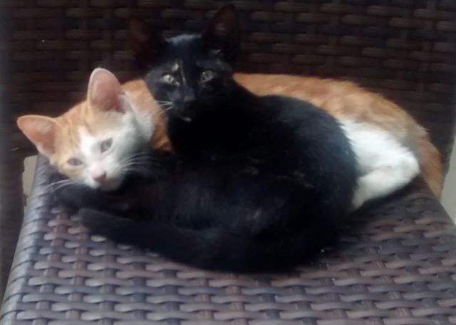 One is ginger and white, the other is black with tawny flecks. Initially I named them after people I don't like but now I call them Romulus and Remus. I made a toy out of a piece of wool and a bottle cap this evening, and they enjoyed playing with it. The mother I call Julie.