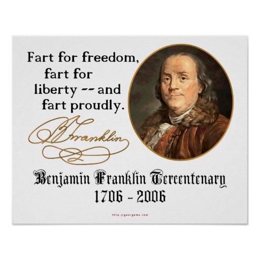 It's...real.Originally posted by Benjamin Franklin“Let every fart count as a peal of thunder for liberty. Let every fart remind the nation of how much it has let pass out of its control. So fart, and if you must, fart often. But always fart without apology. Fart for freedom, fart for liberty… and fart proudly!”