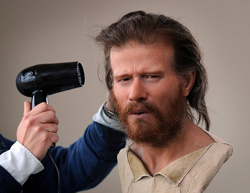 Nilsson puts the finishing touches on the reconstructed face of the ‘Stonehenge Man'. Explains Nilsson about the subject: "The grave was discovered in the late 19th century but the bones were recently the subject of extensive analysis and surveys. Some of the results from those analyses are amazing: He was born around 5,500 years ago well to the west or north west of the Stonehenge area, probably in what is today Wales, Devon or Brittany. At 2 years old he moved to the area near Stonehenge, and aged 9 he moved back to the west again. As he grew older his frequency of travel back and forth between those two places increased. How do we know all this? By analyzing the successive layers of the enamel in his teeth, isotopic values of strontium and oxygen reflected the sources of his drinking water.
