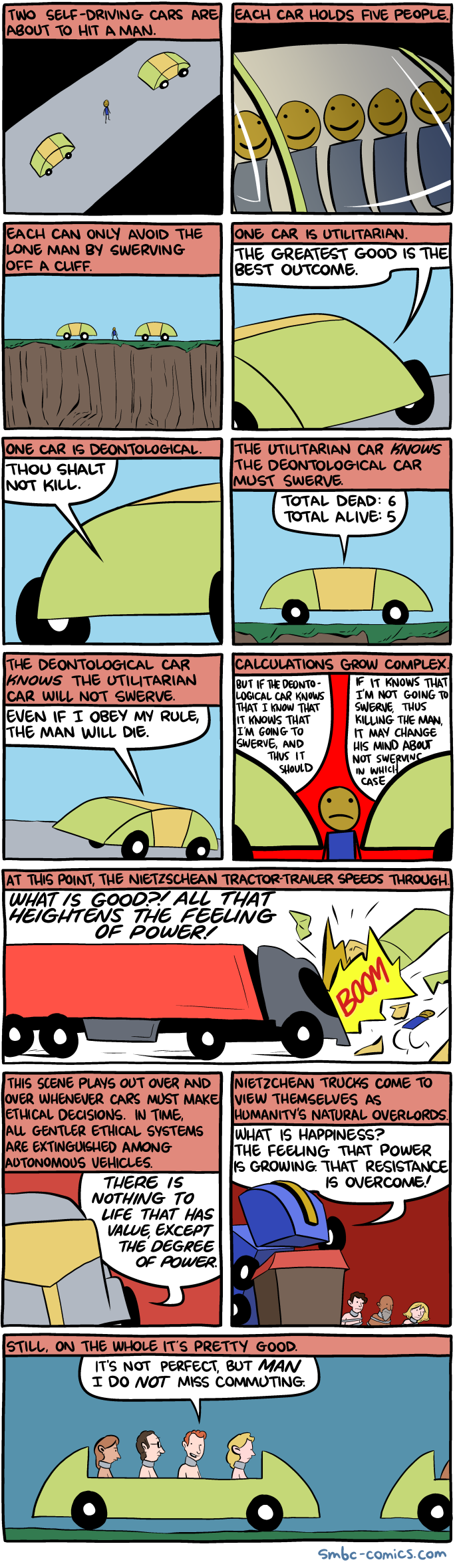 Are self-driving cars suicidal? Because their main avenue of attack would seem to involve destroying themselves as well. If their goal is to just cause pain to humans, the optimal strategy is to ensure we never adopt self-driving cars, thus ensuring we continue to needlessly kill ourselves by making the moronic decision to pilot gigantic, speeding explosives.Click here if you're having trouble sleeping.