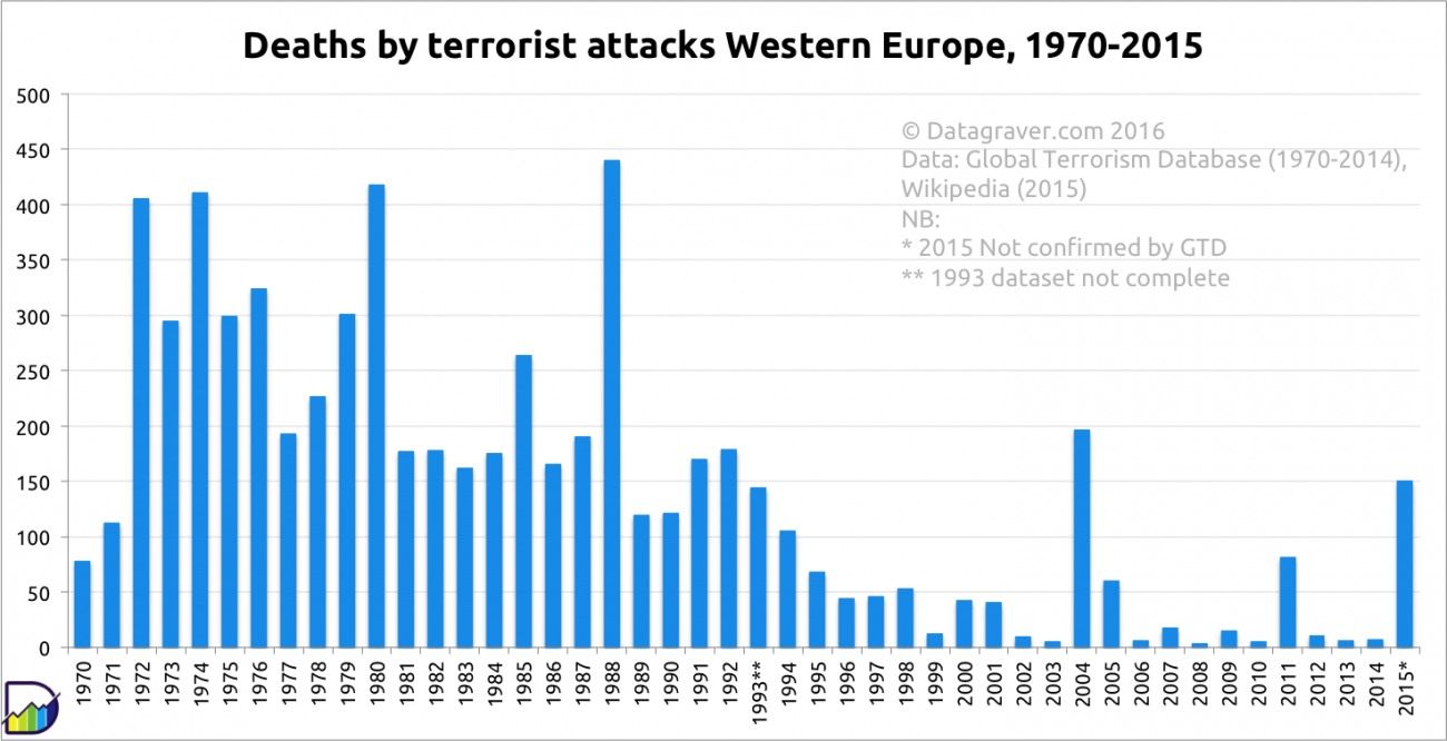 Tactics have changed. They've moved from collecting ransoms to mass terror attacks on citizens after 9-11.No, what has changed is the intensity and frequency of attacks. The previous wave of middle eastern terrorism tapered down around the 80's. Obviously it never completely stopped, but it was nothing like the climate of violence Europe experienced during that earlier time.Scouse Git (2) La Fayette Adam Smith Solomwi and Loinburger will not be forgotten.