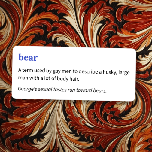 bear: A term used by gay men to describe a husky, large man with a lot of body hair.