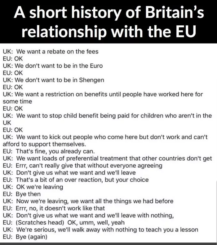 Also dinner doubles down on stupid. You really think it's better if indivindual nations would do their own deals with the UK? Ok. Get ready to hand over, gilbraltar, the parthenon marbles and whatever tables not glued to the floor the dearly departed stole. The european commission is the best friend the UK has....