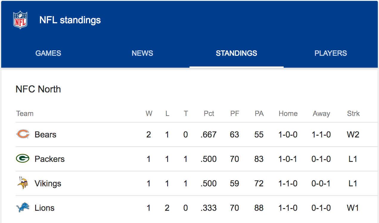 I get to post something that hasn't happened since December 2013: The Chicago Bears are in sole possession of first place.
