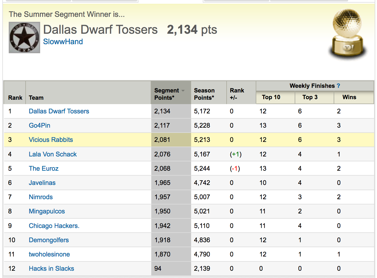 1 Vicious Rabbits 1,671 5,213 0 10 5 2 2 Chicago Hackers. 1,642 5,110 0 10 4 1 3 Go4Pin 1,640 5,228 0 11 5 1 4 The Euroz 1,617 5,244 0 11 4 2 5 Lala Von Schack 1,592 5,167 0 11 3 0 6 Mingapulcos 1,592 5,021 0 9 4 0 7 twoholesinone 1,577 4,790 0 9 2 2 8 Dallas Dwarf Tossers 1,528 5,172 0 9 3 1 9 Javelinas 1,492 4,742 0 10 1 1 10 Demongolfers 1,483 4,836 0 10 0 0 11 Nimrods 1,450 5,007 0 7 2 1 12 Hacks in Slacks 1,307 2,139 0 5 2 0 1 Nimrods 1,600 5,007 0 11 3 0 2 The Euroz 1,559 5,244 0 10 3 2 3 Chicago Hackers. 1,526 5,110 0 11 4 1 4 Dallas Dwarf Tossers 1,510 5,172 0 10 4 2 5 Lala Von Schack 1,499 5,167 0 9 3 0 6 Mingapulcos 1,479 5,021 0 11 4 0 7 Go4Pin 1,471 5,228 0 11 4 3 8 Vicious Rabbits 1,461 5,213 0 10 3 1 9 Demongolfers 1,435 4,836 0 9 2 1 10 twoholesinone 1,343 4,790 0 8 3 0 11 Javelinas 1,285 4,742 0 8 0 0 12 Hacks in Slacks 738 2,139 0 2 1 1