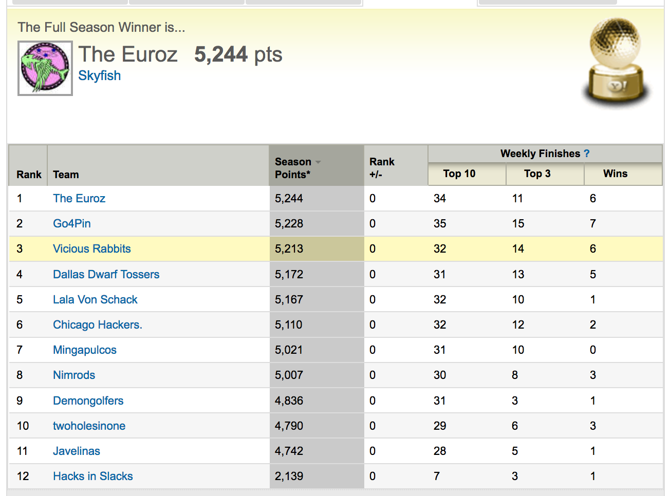 congrats to Slowwhand on winning the summer, and back for another championship, Skyfish wins the FedEx Cup