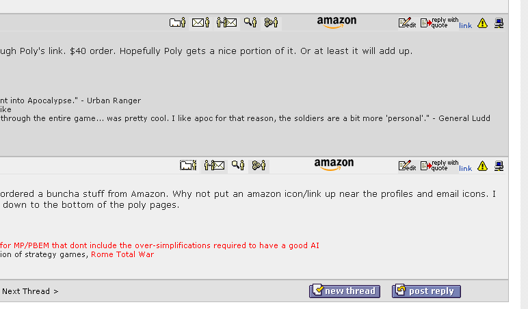 Damn! I forgot all about it. I just ordered a buncha stuff from Amazon. Why not put an amazon icon/link up near the profiles and email icons. I use amazon a lot but never scroll down to the bottom of the poly pages.We need seperate human-only games for MP/PBEM that dont include the over-simplifications required to have a good AI