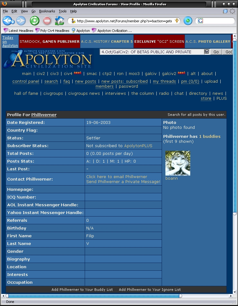 The following posts show screenshots testing the cause and effect utilizing the account of my very good friend Phillwerner. With his name listed once, but last on my buddy list, I don't show in his profile. When I add another username under Phillwerner, then I'm visible as a buddy on his profile. It can be any username, but for the purposes of this experiment, I just added Phill's name again - listing it twice.