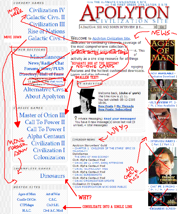 With the understanding that we all care about Apolyton and are simply making suggestions for the improvement of 'poly, not to criticize, I do agree with IW's thoughts on the subject. I think the Apolyton front page is rather disorganized and could very much be cleaned up to be more helpful, informative, and visually appealing.