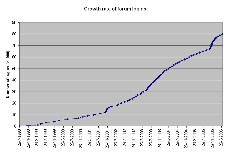 Average numbersCode:members date of days to reach days to reach (in 1000) milestone (cumulative) 0 26-7-1998 0 0 1 4-4-1999 252 252 2 7-5-1999 33 285 3 28-7-1999 82 367 4 13-11-1999 108 475 5 23-1-2000 71 546 6 20-5-2000 118 664 7 14-10-2000 147 811 8 20-12-2000 67 878 9 19-2-2001 61 939 10 14-5-2001 84 1023 11 16-8-2001 94 1117 12 19-10-2001 64 1181 13 6-11-2001 18 1199 14 10-11-2001 4 1203 15 22-11-2001 12 1215 16 11-12-2001 19 1234 17 17-1-2002 37 1271 18 5-4-2002 78 1349 19 27-4-2002 22 1371 20 8-6-2002 42 1413 21 16-7-2002 38 1451 22 31-8-2002 46 1497 23 1-10-2002 31 1528 24 5-11-2002 35 1563 25 28-11-2002 23 1586 26 26-12-2002 28 1614 27 22-1-2003 27 1641 28 27-2-2003 36 1677 29 11-3-2003 12 1689 30 4-4-2003 24 1713 31 12-5-2003 38 1751 32 25-5-2003 13 1764 33 6-6-2003 12 1776 34 17-6-2003 11 1787 35 30-6-2003 13 1800 36 13-7-2003 13 1813 37 30-7-2003 17 1830 38 17-8-2003 18 1848 39 2-9-2003 16 1864 40 20-9-2003 18 1882 41 10-10-2003 20 1902 42 27-10-2003 17 1919 43 10-11-2003 14 1933 44 23-11-2003 13 1946 45 9-12-2003 16 1962 46 27-12-2003 18 1980 47 13-1-2004 17 1997 48 1-2-2004 19 2016 49 26-2-2004 25 2041 50 23-3-2004 26 2067 51 15-4-2004 23 2090 52 10-5-2004 25 2115 53 4-6-2004 25 2140 54 1-7-2004 27 2167 55 28-7-2004 27 2194 56 25-8-2004 28 2222 57 27-9-2004 33 2255 58 30-10-2004 33 2288 59 2-12-2004 33 2321 60 2-1-2005 31 2352 61 1-2-2005 30 2382 62 7-3-2005 34 2416 63 15-4-2005 39 2455 64 27-5-2005 42 2497 65 10-7-2005 44 2541 66 27-8-2005 48 2589 67 10-10-2005 44 2633 68 28-10-2005 18 2651 69 31-10-2005 3 2654 70 4-11-2005 4 2658 71 8-11-2005 4 2662 72 14-11-2005 6 2668 73 23-11-2005 9 2677 74 3-12-2005 10 2687 75 17-12-2005 14 2701 76 31-12-2005 14 2715 77 17-1-2006 17 2732 78 7-2-2006 21 2753 79 7-3-2006 28 2781 80 12-4-2006 36 2817