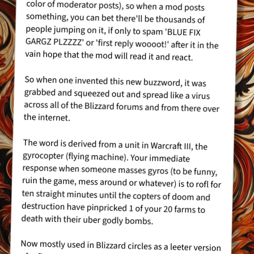 roflcopter: Invented by a Blizzard moderator on the Warcraft III forum. There is always much whining going on on those official forums, much sucking up to...