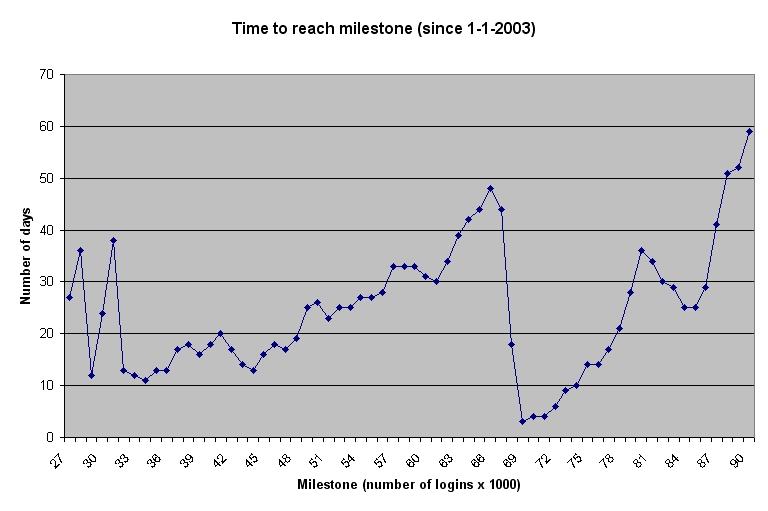 members date of days to reach days to reach (in 1000) milestone (cumulative) 0 26-07-1998 0 0 1 04-04-1999 252 252 2 07-05-1999 33 285 3 28-07-1999 82 367 4 13-11-1999 108 475 5 23-01-2000 71 546 6 20-05-2000 118 664 7 14-10-2000 147 811 8 20-12-2000 67 878 9 19-02-2001 61 939 10 14-05-2001 84 1023 11 16-08-2001 94 1117 12 19-10-2001 64 1181 13 06-11-2001 18 1199 14 10-11-2001 4 1203 15 22-11-2001 12 1215 16 11-12-2001 19 1234 17 17-01-2002 37 1271 18 05-04-2002 78 1349 19 27-04-2002 22 1371 20 08-06-2002 42 1413 21 16-07-2002 38 1451 22 31-08-2002 46 1497 23 01-10-2002 31 1528 24 05-11-2002 35 1563 25 28-11-2002 23 1586 26 26-12-2002 28 1614 27 22-01-2003 27 1641 28 27-02-2003 36 1677 29 11-03-2003 12 1689 30 04-04-2003 24 1713 31 12-05-2003 38 1751 32 25-05-2003 13 1764 33 06-06-2003 12 1776 34 17-06-2003 11 1787 35 30-06-2003 13 1800 36 13-07-2003 13 1813 37 30-07-2003 17 1830 38 17-08-2003 18 1848 39 02-09-2003 16 1864 40 20-09-2003 18 1882 41 10-10-2003 20 1902 42 27-10-2003 17 1919 43 10-11-2003 14 1933 44 23-11-2003 13 1946 45 09-12-2003 16 1962 46 27-12-2003 18 1980 47 13-01-2004 17 1997 48 01-02-2004 19 2016 49 26-02-2004 25 2041 50 23-03-2004 26 2067 51 15-04-2004 23 2090 52 10-05-2004 25 2115 53 04-06-2004 25 2140 54 01-07-2004 27 2167 55 28-07-2004 27 2194 56 25-08-2004 28 2222 57 27-09-2004 33 2255 58 30-10-2004 33 2288 59 02-12-2004 33 2321 60 02-01-2005 31 2352 61 01-02-2005 30 2382 62 07-03-2005 34 2416 63 15-04-2005 39 2455 64 27-05-2005 42 2497 65 10-07-2005 44 2541 66 27-08-2005 48 2589 67 10-10-2005 44 2633 68 28-10-2005 18 2651 69 31-10-2005 3 2654 70 04-11-2005 4 2658 71 08-11-2005 4 2662 72 14-11-2005 6 2668 73 23-11-2005 9 2677 74 03-12-2005 10 2687 75 17-12-2005 14 2701 76 31-12-2005 14 2715 77 17-01-2006 17 2732 78 07-02-2006 21 2753 79 07-03-2006 28 2781 80 12-04-2006 36 2817 81 16-05-2006 34 2851 82 15-06-2006 30 2881 83 14-07-2006 29 2910 84 08-08-2006 25 2935 85 02-09-2006 25 2960 86 01-10-2006 29 2989 87 11-11-2006 41 3030 88 01-01-2007 51 3081 89 22-02-2007 52 3133 90 22-04-2007 59 3192