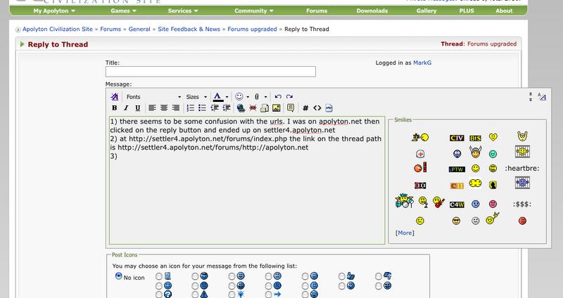 1) there seems to be some confusion with the urls. I was on apolyton.net then clicked on the reply button and ended up on settler4.apolyton.net