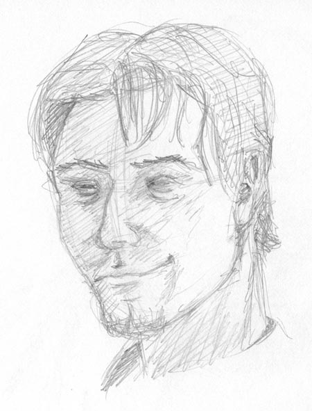 A larger version of earlier drawing since it was asked for. I remember drawing this in the dorm's bathroom (they had this awesome big mirror so I just brought a chair in and started doodling away) but such conditions tend not to be conducive to drawing, so you'll notice I really screwed up the eyes.... Although, now that I recall, I was squinting at the time... must have been bright lights or something.