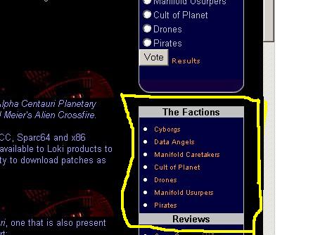 If anyone is interested in faction profiles, I will be able to publish them as part of my fiction project in fiction forum in a week or maybe two, complete with graphics, quotes, and all available knowledge about them from both faction profiles from manual, game datalinks, GURPS handbook and firaxis profiles.SMAC/X FAQ | Chiron Archives