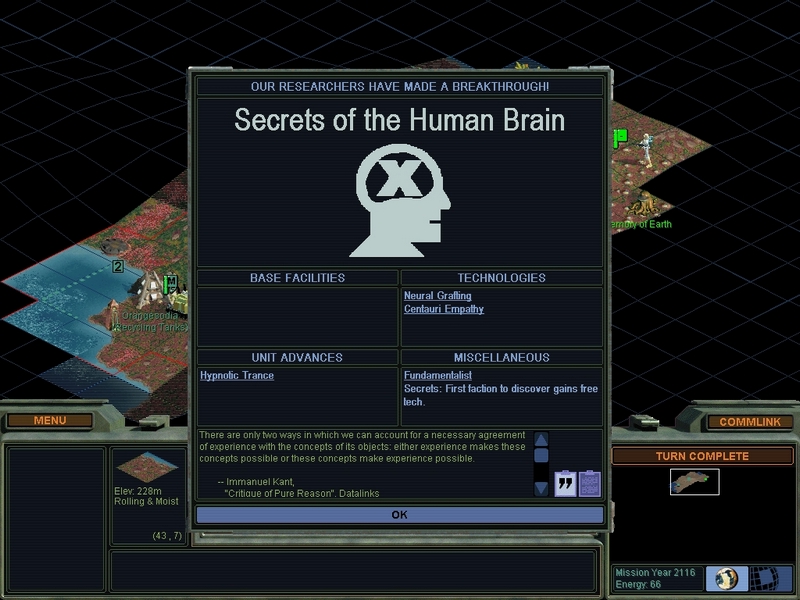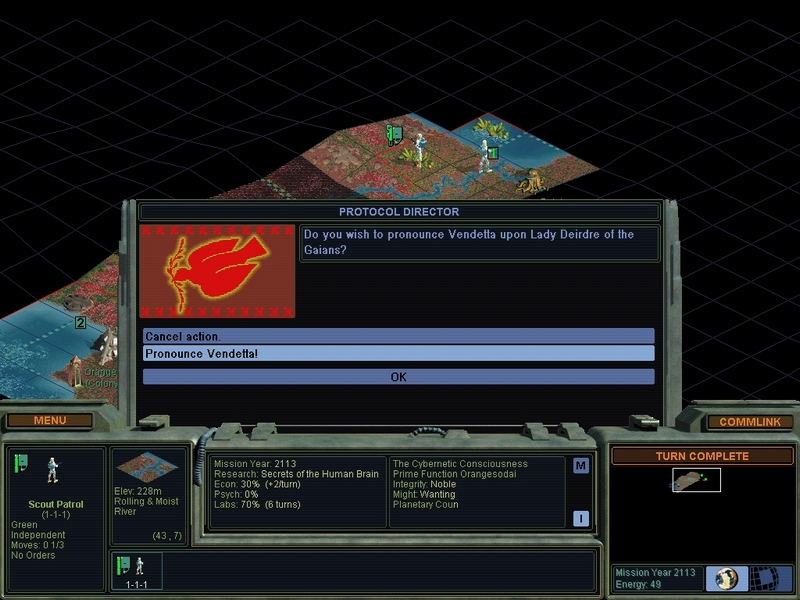 I wanted to use a new faction. All those years ago playing SMAC ... I like to play as Zak or Deirdre most of the time. My most natural "fun" game was to take a Green tact relying on farmed Mindworms for mid-game defense and exploring. By "defense" of course I mean taking pre-emptive action against any and all neighbors before they got any ideas ... This way the game was a bit of everything.