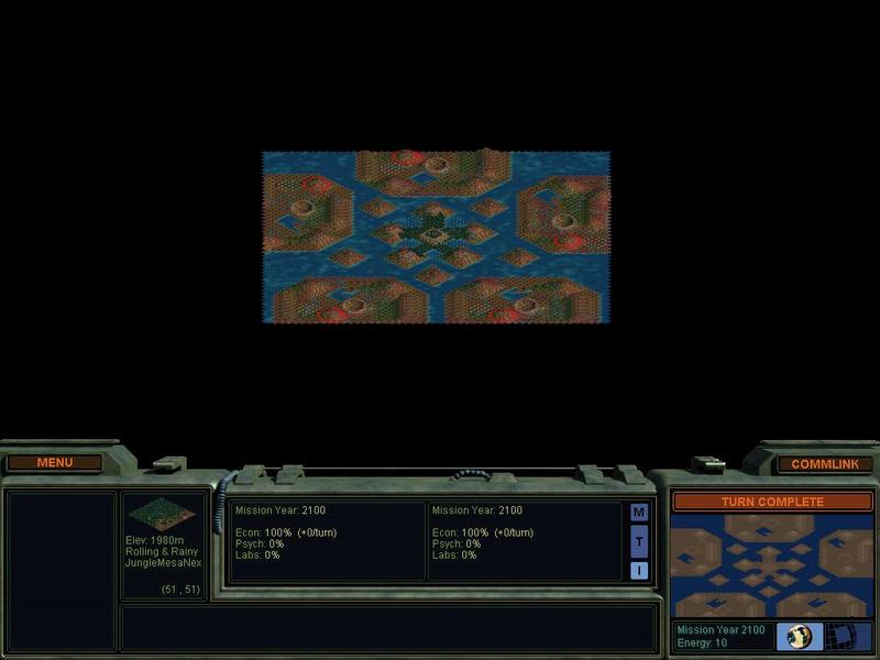 So, I regenerated the map to remove the pods. Started a new game with me as the University and the other six original SMAC factions. As before, gave each faction a free former and adjusted the research rate to x3. Here's a status report on my new game: