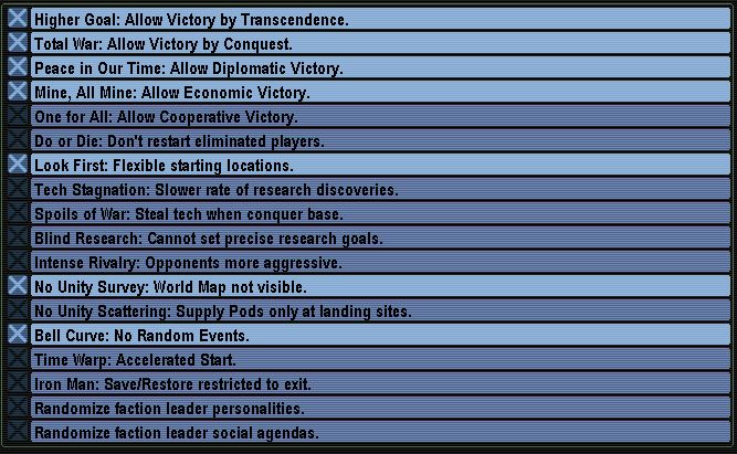 ______________________________________ Preference.. | Settings Map size | ? Ocean | ? Erosion | ? Life | ? Clouds | ? Difficulty | ? Transcend | ? Diplomatic | ? Economic | ? Cooperative | ? Do or Die | ? Flexible start | ? Tech stag | ? Spoils of war | ? Blind research | ? Intense riv | ? No survey | ? No scatter | ? No rnd events | ? Time Warp | ? Iron man | ? Rand person | ? Rand social | ?