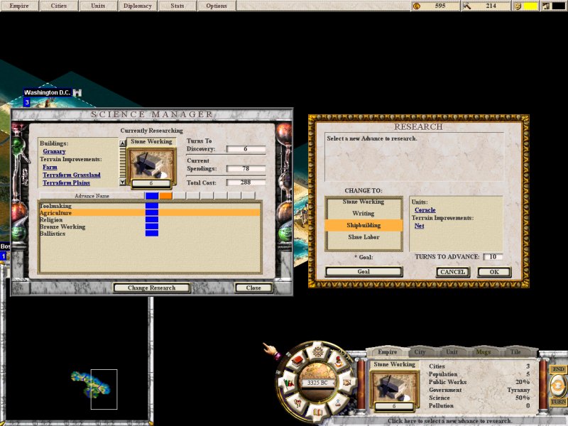 With the way our technology model works, a tree like in Civ is out of the question. CTP2 on the other hand, has a great feature that could be used in Clash. It's the goal button seen in the screenshot below. You click this button, and a panel opens up which lets you set your long term research goal, by the tech's name, by Infrastructure (if you wanted to build factories for instance), by Units (if you wanted to build knights), and possibly other factors that I don't recall at the moment. Anyhow, a few clicks, and you're done guiding the tech research, and a few clicks on the budget interface and you can set the spending for it as well.