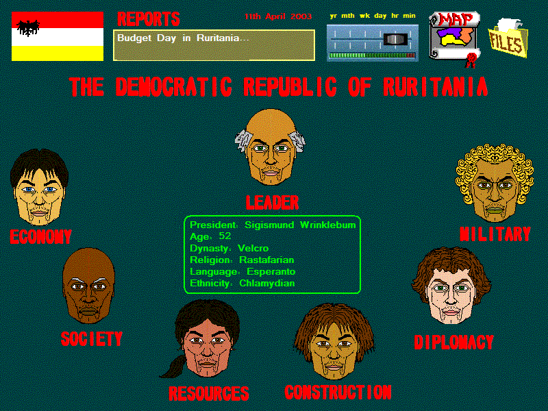 i' imagining nice pics of government buildings like Big Ben, the Whithouse, Kremlin all that stuff... but it clearly can't be like that if we want to reflect the cultural/stylistic diversity -and the level of technology... it's a tricky one, but i think you're political and characters ideas demand some kind of rpg/graphic adventure style screens... this returns me to the idea of city managemtn...