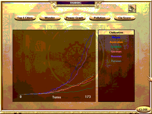 I am the Mayans playing a World map. I have conquered USA, South America, New Zealand and Southern America. I am playing against the Germans (holding all mainland Europe + Norway + Sweden), Scots (taken Finland, Iceland and UK), Persia (taken Middle East and North Africa), Australia (No maps, I think Australia) and Russia (Russia, Far East, Indonesia, and Japan). The latter continues to fight me for 1st place on the PG.