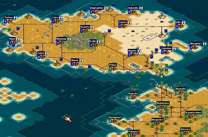 Screenie of the final battle. The tile near Tonis loaded coracle was a city, Cloud disbanded so it couldnt be taken, then Toni went on to take Philae.