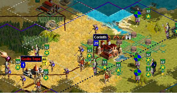 The Turkish invasion force is more than 100 units now. They are bombarding cities and pillaging. Theres an invasion force of 50 Arabians who are pestering my southern cities and a whole bunch of Babylonian units around too. I've decided to concentrate on defending my south and I have decided to let my Northern cities fight it out on their own though they don't stand much of a chance. Great Game