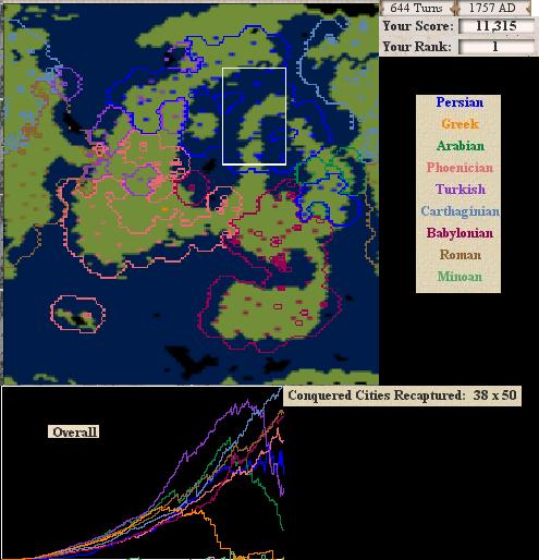 At the same time I have used the teu knights to disrupt the Arabian Empire which is meeting the same fate as the Greeks. Although I can't hold on to the cities I capture from their other rivals can. I leave the cities and they take them. The former Greek Empire is in shamples with massive population losses from constant warfare and even starvation and rioting. Cities that were once size thirty are gone! Many of the Arabian cities are meeting the same fate.
