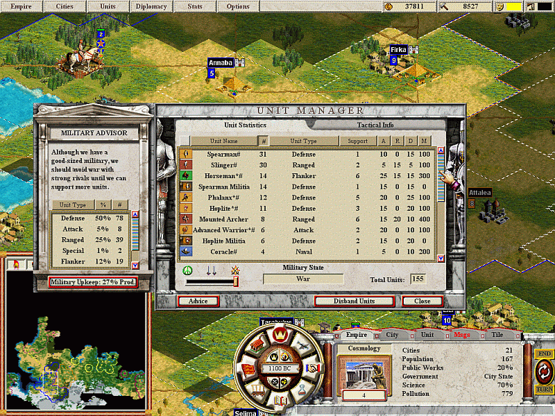 1400 - Huan the Economist plans to rebuild after plague by starting trade with caravans. His friendly connections with the Arabians has earned a trade agreement soon to be very valuable. Some cities with population issues will begin apothecaries. The two least productive cities are producing infantry while the most productive non-wonder cities are producing calvary. There are however more cities producing caravan than anything else.