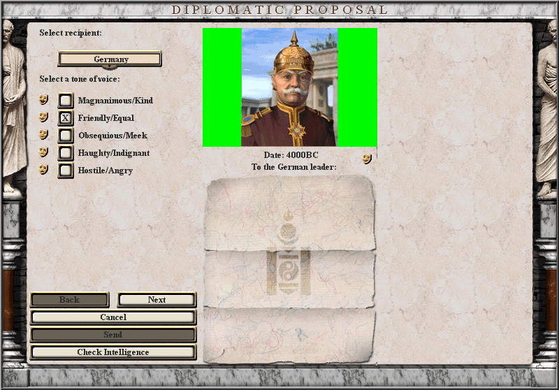 There is a small problem that might become annoying in future. The top (and bottom but you can't see it) of the parchments have a black horizontal line, this was because the old proposal window was so small, the parchment would touch the top and bottom edges of the window. If you don't use a diplomat/leader photo long enough, it will show the line above the parchment. This is also why I have the parchment touching the bottom panel - to hide the bottom line, as was done on the original proposal window.