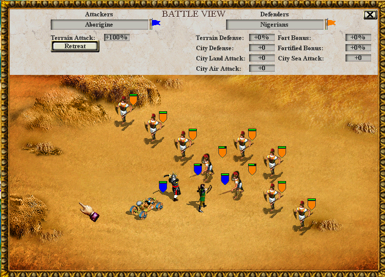 I suppose another way to do it would be to take out the defensive counterattack all together. The defender would still get all his defense value + bonuses and the attacker would always use his attack value (and I would definitely take away the terrain bonus in this case). It would still give the edge to the defender in an otherwise equal battle.Battle animations for both sides would trigger at the same time so the defensive guys aren't frozen.Whoops, ctp1 on the brain