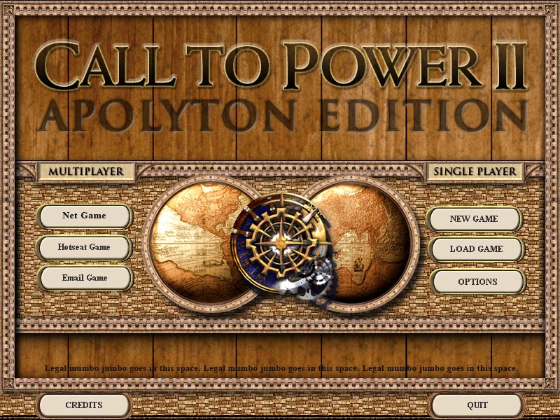 I like the layout but the bricks look excessive now (maybe they can be made larger or something), version number box should also be indented, and central somewhere, maybe on the wood panel just above the disclaimer. Disclaimer looks best black too.Call to Power 2: Apolyton Edition - download the latest version (12th June 2011)