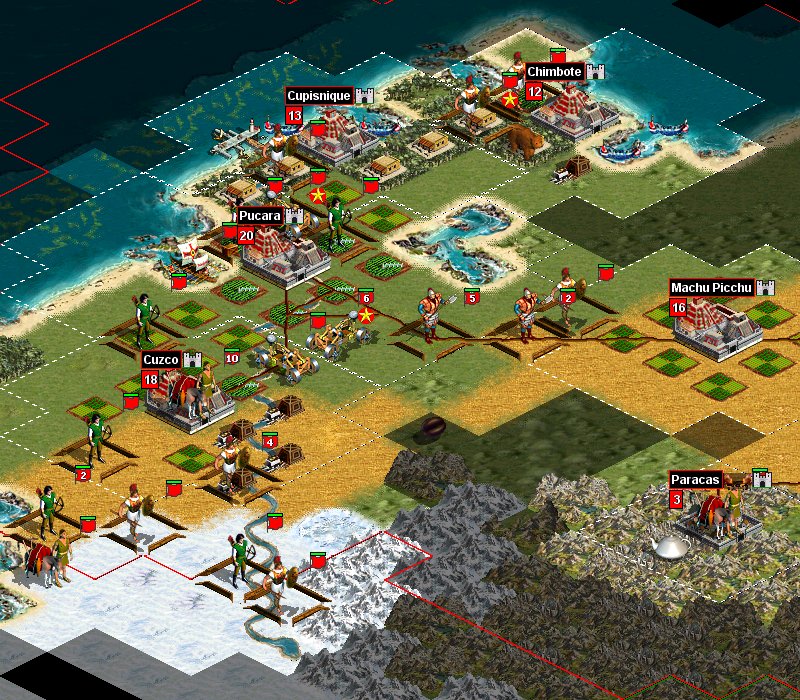 The situation in the 5 res game is similar. But now the Incas are at war with the Germans on the other side of the Incian continent. And again a lot of units on around the Incian cities, although it is no problem for the Incas to combine there forces and march to the German cities. In fact one problem I see on this picture is that there are units on the same tile, but aren't grouped. With all the armies here the Incans could conquer all the German cities on the Incian continent and expell the Germans from the Incian continent.Civ2 military advisor: "No complaints, Sir!"
