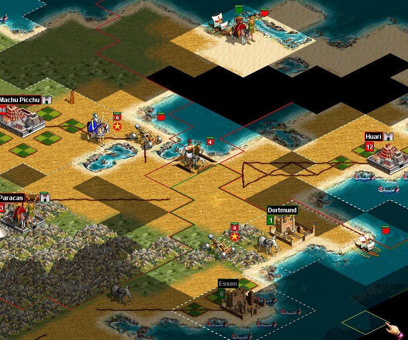 In comparision to the Incas the Germans have it better with their invasion/reinforcement transports. We have again single ships but the Germans have a big target area with their cities at the Incian coast, so it doesn't matter if the ships don't share the same target and the fresh troops are good for the city defence. However there is also something positive to report for the Incas. There is an Incian stack with a Catapult in near Dortmund, the garrision of Dortmund just contains one unit and so in fact Dortmund will be history in two turns.Civ2 military advisor: "No complaints, Sir!"
