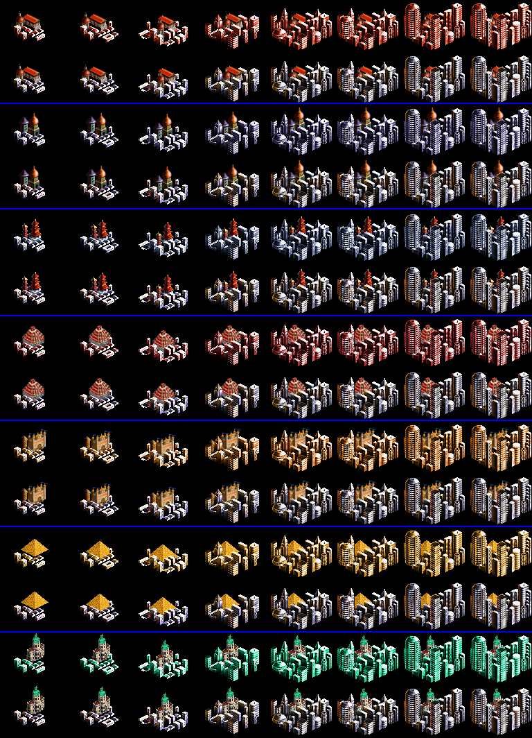 The bottom row of cities is the palace and Egyptian modern city styles. Notice that these have different coloured skyscrapers, I guess to differentiate them from each other more.