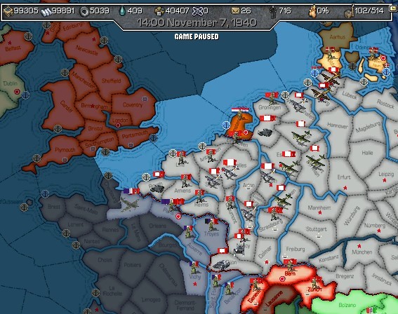 Well we had a hard time beating the Netherlands, they didn¡¦t fall until sometime in mid 1941! I guess I didn¡¦t send sufficient forces to that part of the front because all my panzers were slicing through Belgium and northern France. Belgium fell but France held out. The campaign dragged. Below is a screenshot of the situation in November 1940.