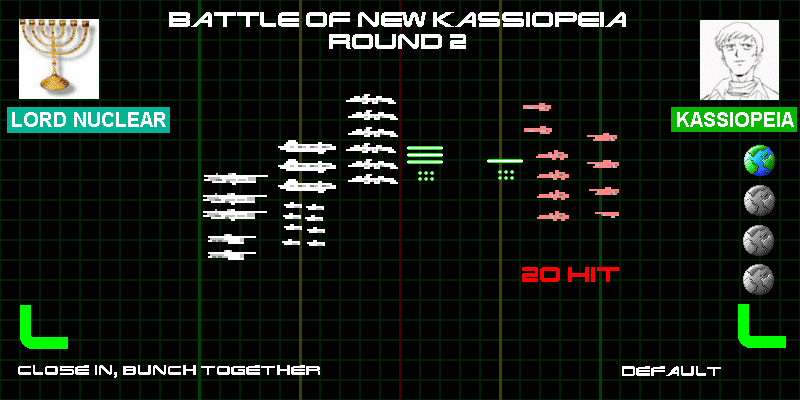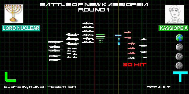 Kass went on to fire lasers against Lord Nuclear's torpedoes in a futile third round, where the Kass fleet took another 24 hits before capitulation by ritual self-destruction.
