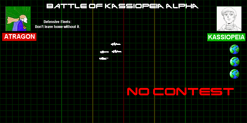 Joncha returned home to parades and shore leave. Kassiopeia, however, recieved an urgent transmission from base: Four of Atragon's cruisers had entered the system and occupied the homeworlds.