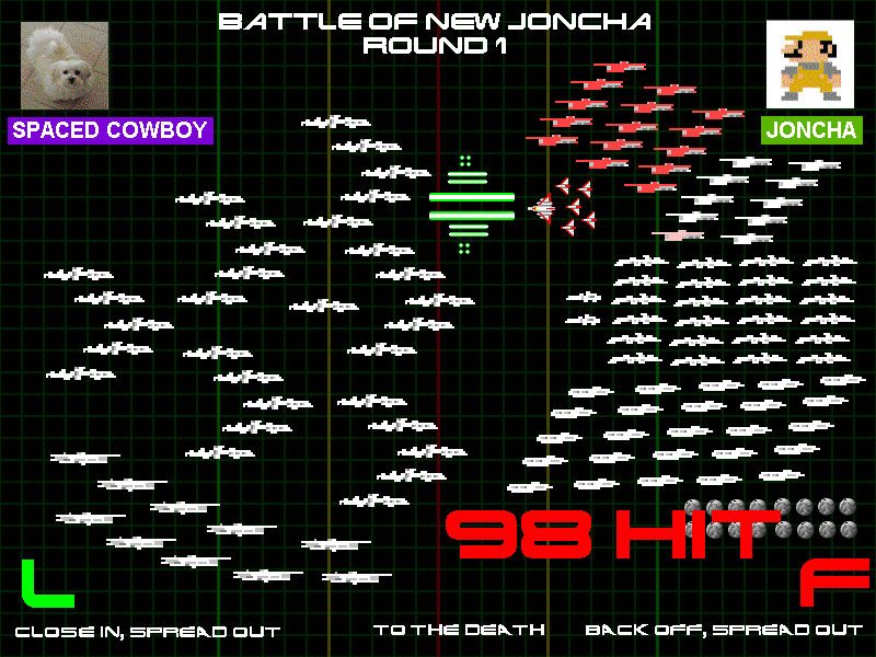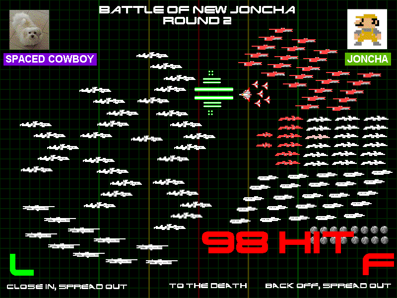 but with both of them spread out, Spaced 0 Torpedos are halved to 0, while Joncha's are cut in half, so he may yet have a chance if his lack of Torpedo's can survive until the next round of Lasers (Spaced) versus Fighters (Joncha)."Clearly I'm missing the thread some of where the NFL actually is." - Ben Kenobi on his NFL knowledge